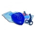 A premium AED preparation kit, comprising a surgical razor, trauma shears, a drying towel, 2 pairs of nitrile gloves, a hazardous waste disposal bag, a hard cased CPR mask, and alcohol swabs.